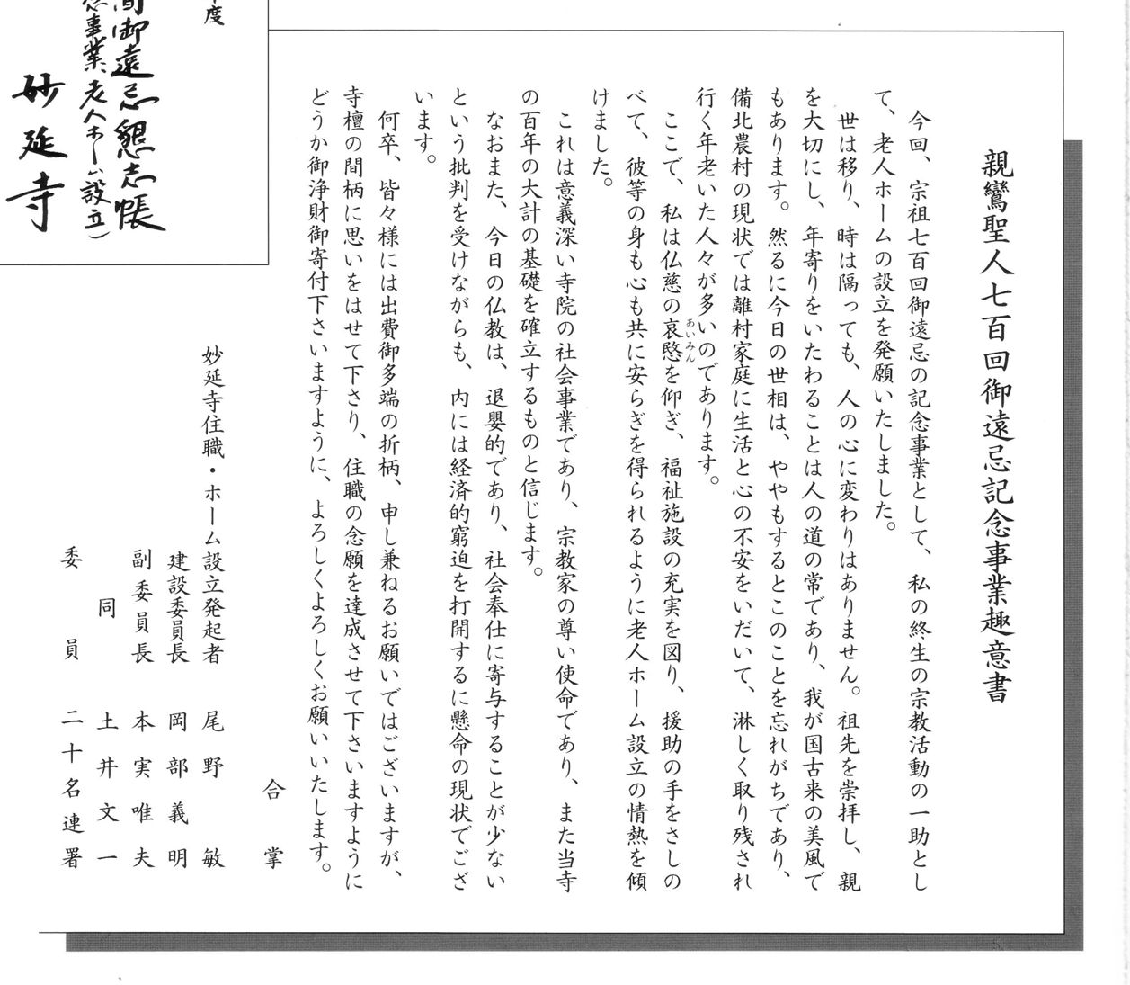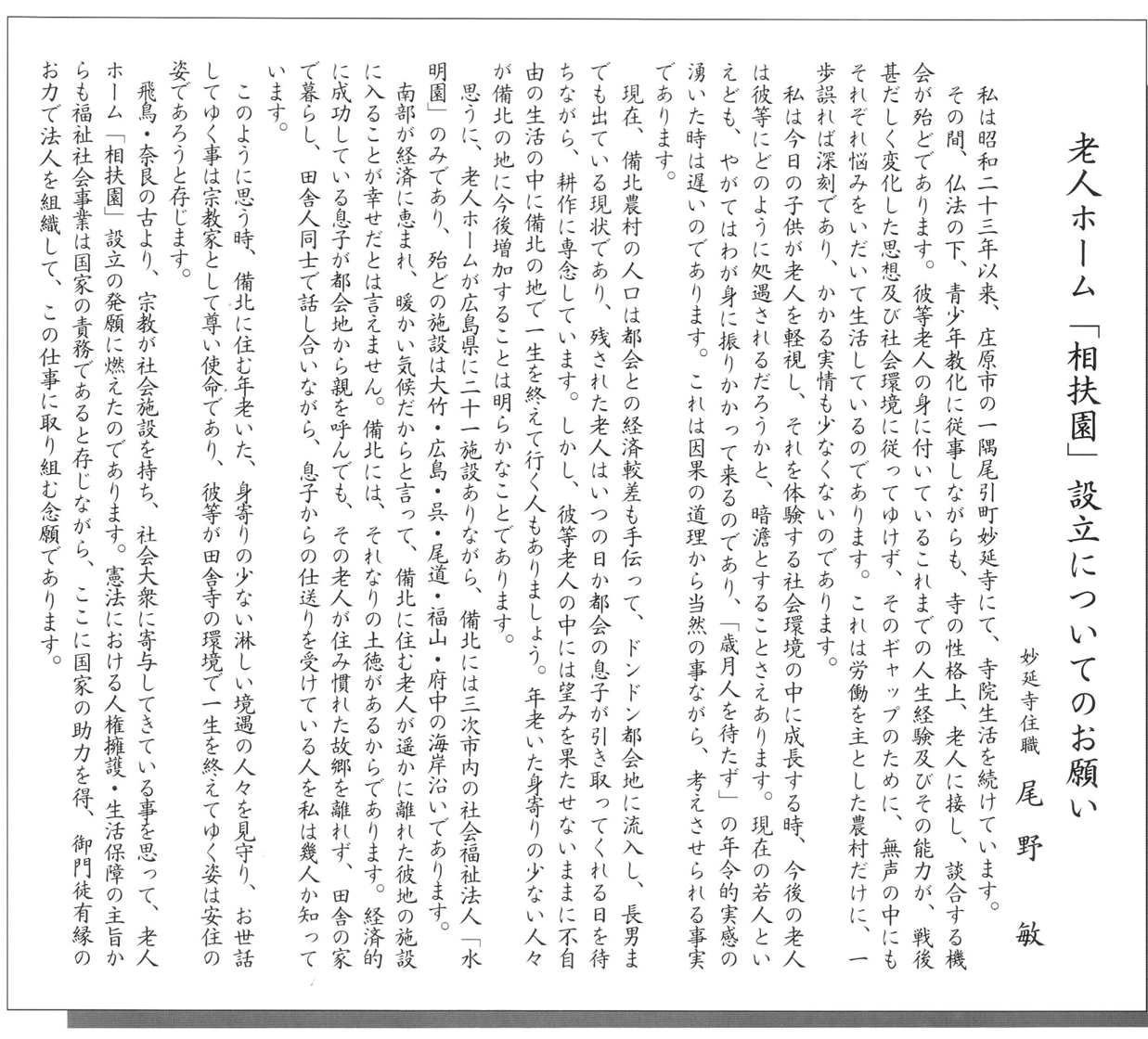 社会福祉法人相扶会は妙延寺を母体として設立されました。約500年の歴史を持つ浄土真宗本願寺派のお寺です。 老人ホーム「相扶園」設立についてのお願い |
